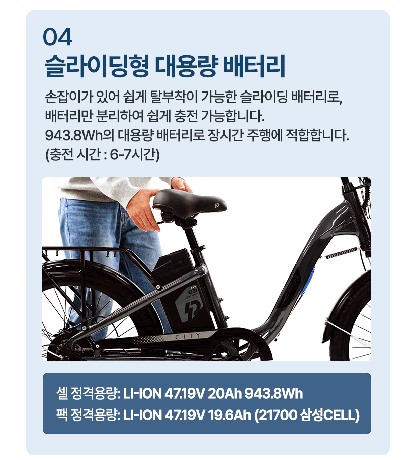 | 배터리 | 셀 정격용량: LI-ION 47.19V 20Ah 943.8Wh / 팩 정격용량: LI-ION 47.19V 19.6Ah (21700 삼성CELL) |