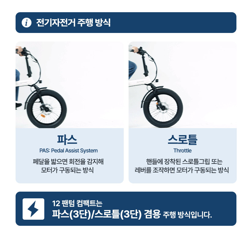 | 주행방식 | PAS(3단) / 스로틀(3단)(크루즈) 겸용 |