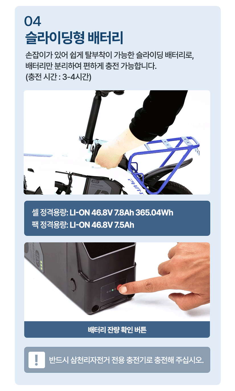 | 배터리 | 셀 정격용량: LI-ON 46.8V 7.8Ah 365.04Wh / 팩 정격용량: LI-ON 46.8V 7.5Ah |
